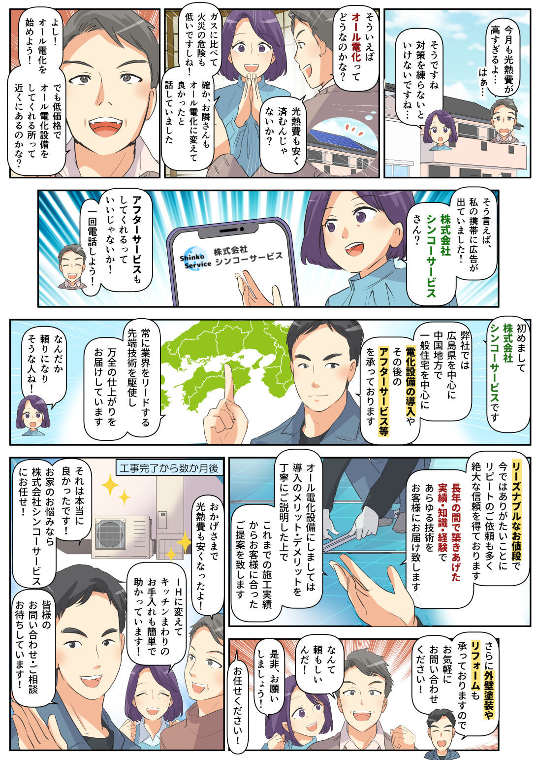 ご家庭からの「困った!」も、オフィス・店舗・工場の「何とかならない?」も。個人様・企業様を問わず、幅広いジャンルの電気工事に対応できるのが、株式会社シンコーサービスです! 広島・鳥取エリアで、数多くの施工を手がけてきた私達。豊富な実績がありますので、お客様それぞれの目的に合わせた、最適な施工が可能です。オール電化・太陽光発電・蓄電池・エコキュート、外壁・屋根工事、住宅リフォームまで幅広く対応しています。 見積りやご相談は無料で承っておりますので、お気軽にお問い合わせください!